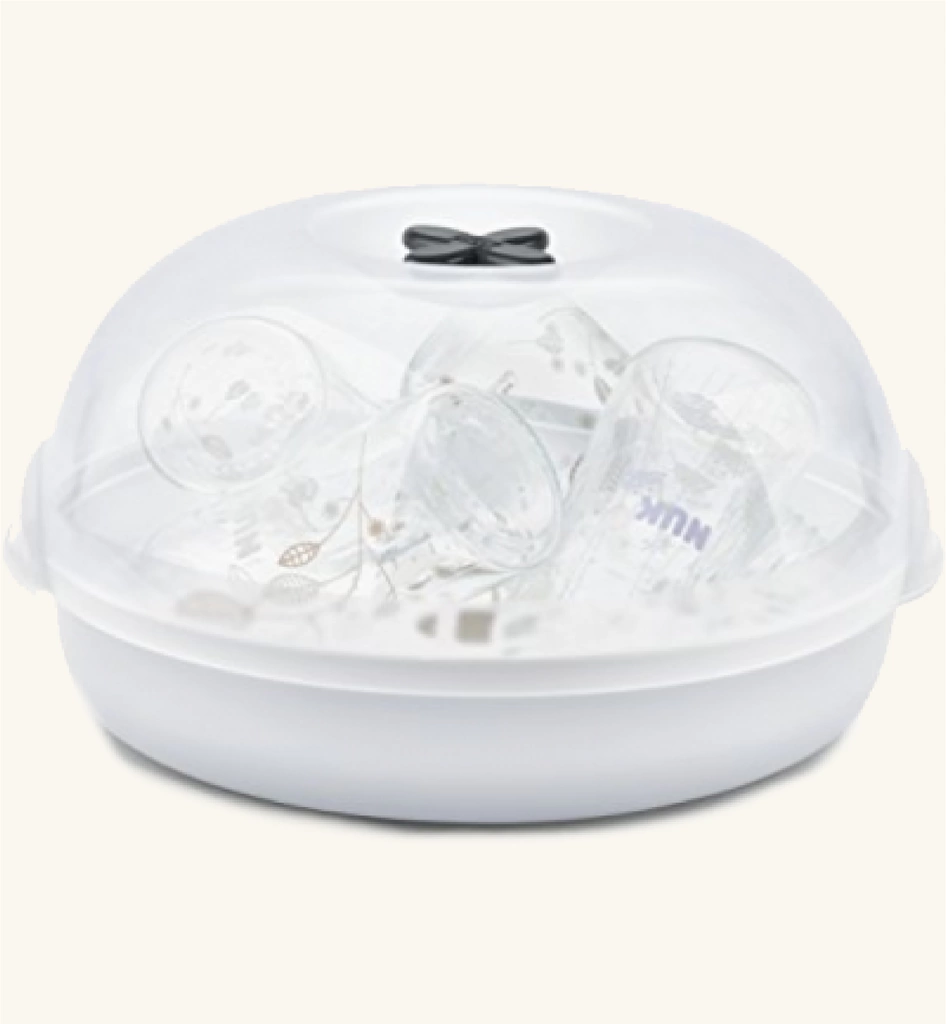 El Esterilizador para Microondas NUK esteriliza mamaderas y accesorios. La esterilización se realiza por vapor, en 4 minutos, sin ningún tipo de productos químicos (ajuste de potencia de microondas 1000-1300 vatios).