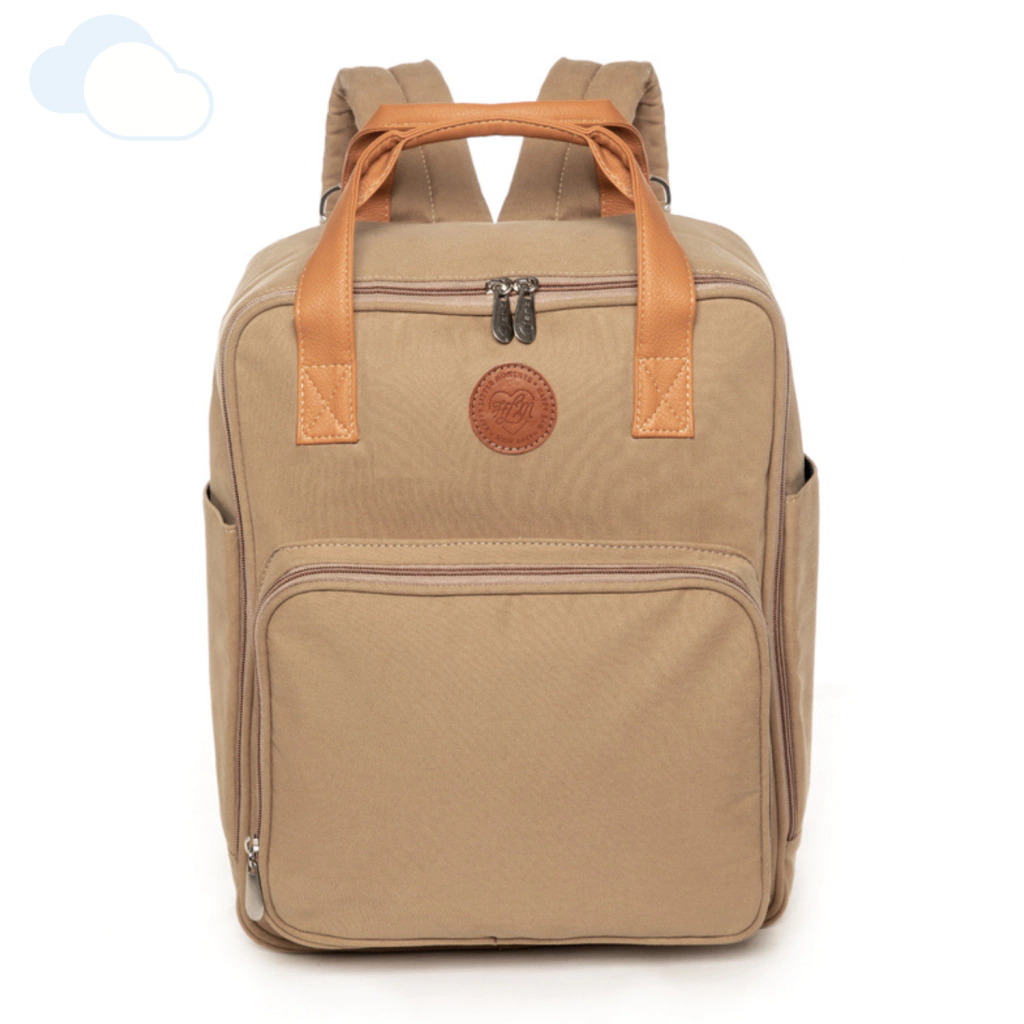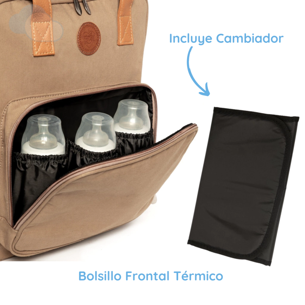 Mochila maternal impermeable en su interior, bolsillo frontal térmico con capacidad para tres mamaderas y dos bolsillos laterales. En su interior posee cinco bolsillos con elástico y cambiador extraíble de fácil lavado. Sistema para colgar en el cochecito (Los ganchos se venden aparte)