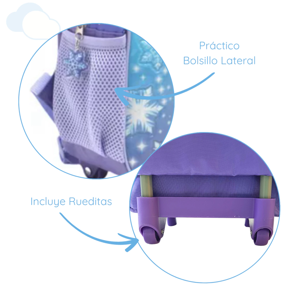 Incluye una tarjeta de identificación para mayor seguridad y un práctico bolsillo de malla para la botella de agua. Su formato con carrito permite transportar útiles escolares y juguetes sin esfuerzo, haciendo que cada día en el colegio sea más divertido y especial.
