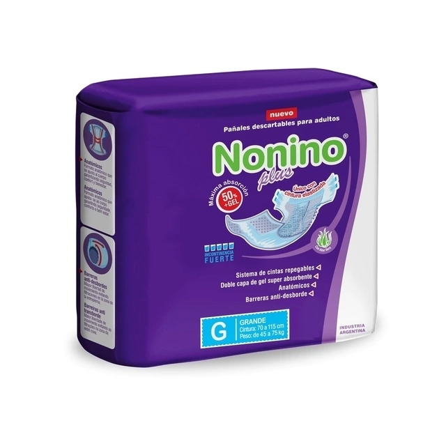Cintura: 70 a 115cm. Peso: de 45kg a 75Kg. Sistema de cintas repegables. Doble capa de gel súper absorbente. Anatómicos. Barreras anti-desborde. En paquetes de 8 unidades.