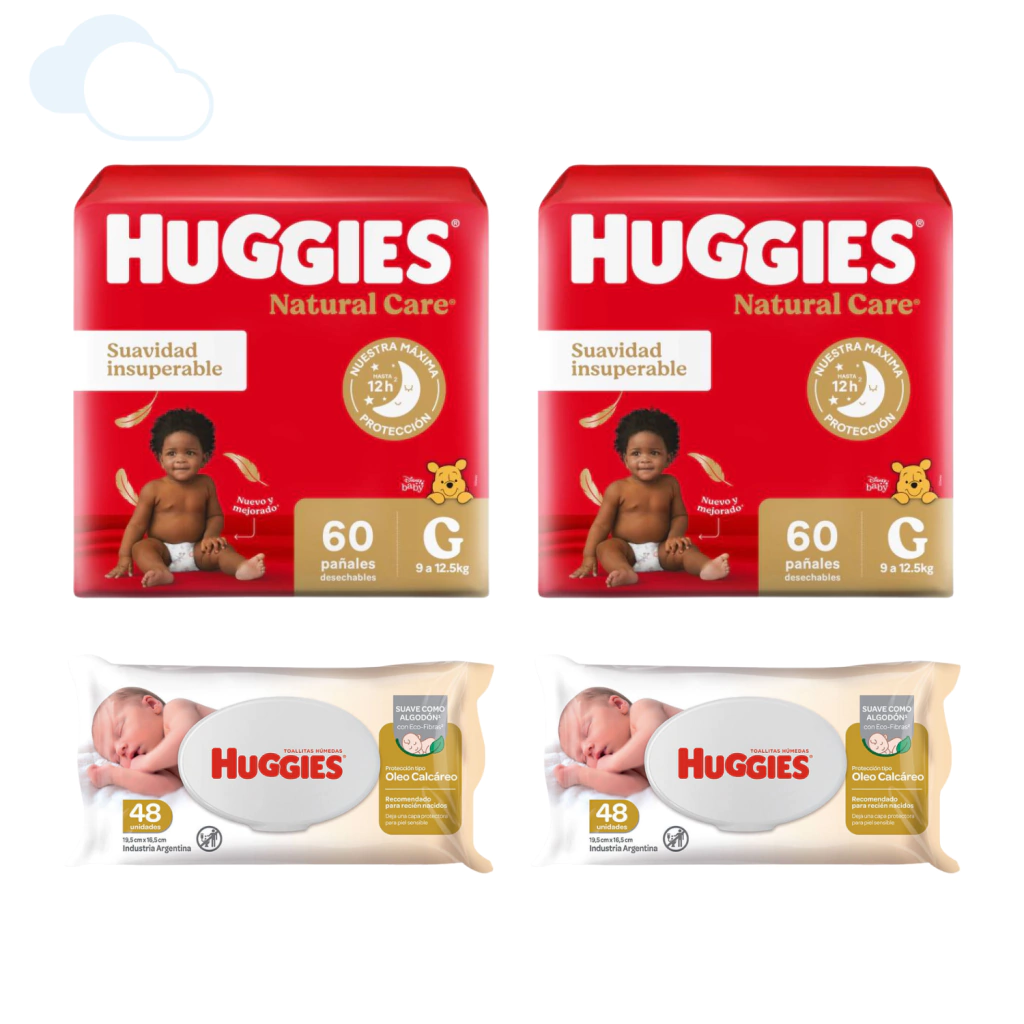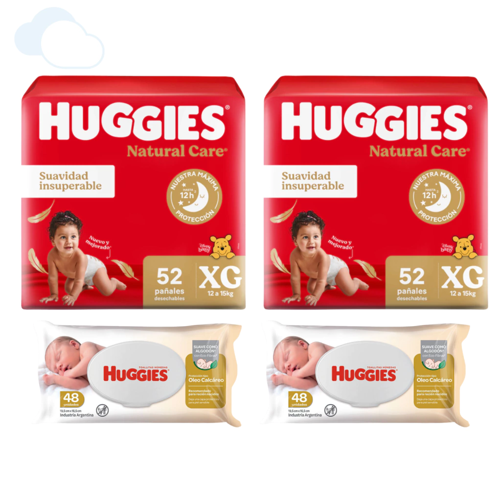 ¡Aprovechá esta oferta única para compras online y brindá la mejor protección a tu bebé! Este combo incluye dos packs de Pañales Huggies Natural Care y dos packs de Toallitas Húmedas con Protección Oleosa.