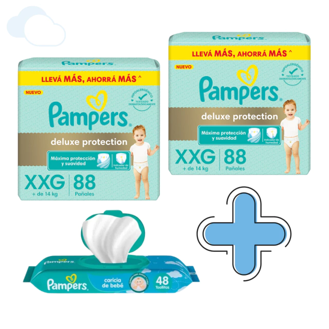 Ofrecé a tu bebé la máxima protección y cuidado con esta promoción exclusiva: llevate 2 paquetes de pañales Pampers Deluxe del mismo talle y 1 paquete de toallitas húmedas de 48 unidades. Todo lo que necesitás para un mes de confort, limpieza y bienestar.